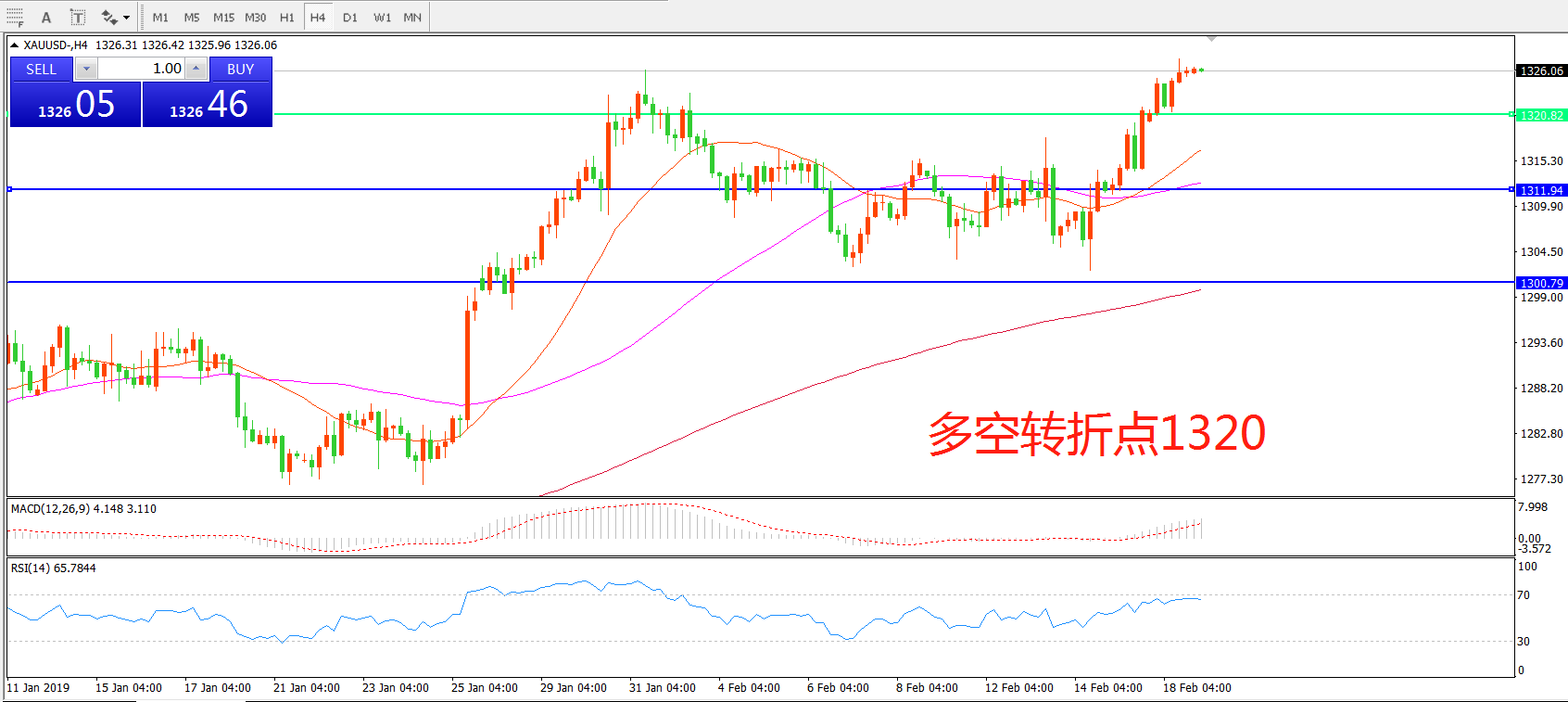 4小时图看,金价在经历震荡后逐渐站稳1320一线,均线系统呈多头排列,MACD红柱逐渐增加,整体走势偏多。