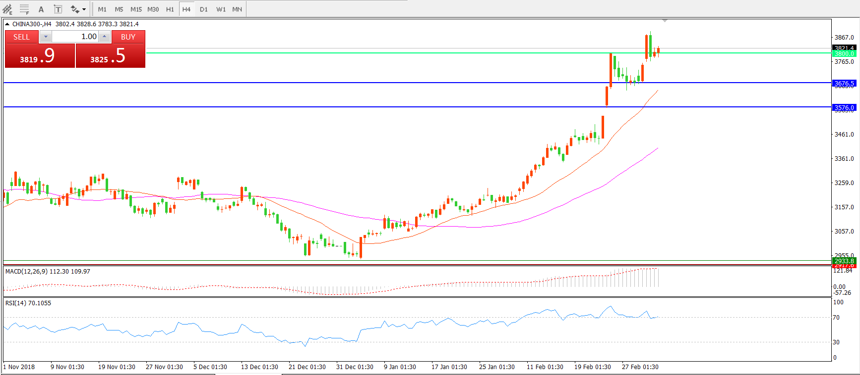 4小时图看,CHINA300中华指数触及上方3800一线出现回落,短期依然处于调整期,但均线系统呈多头排列, MACD红柱增加,整体思路逢低做多。