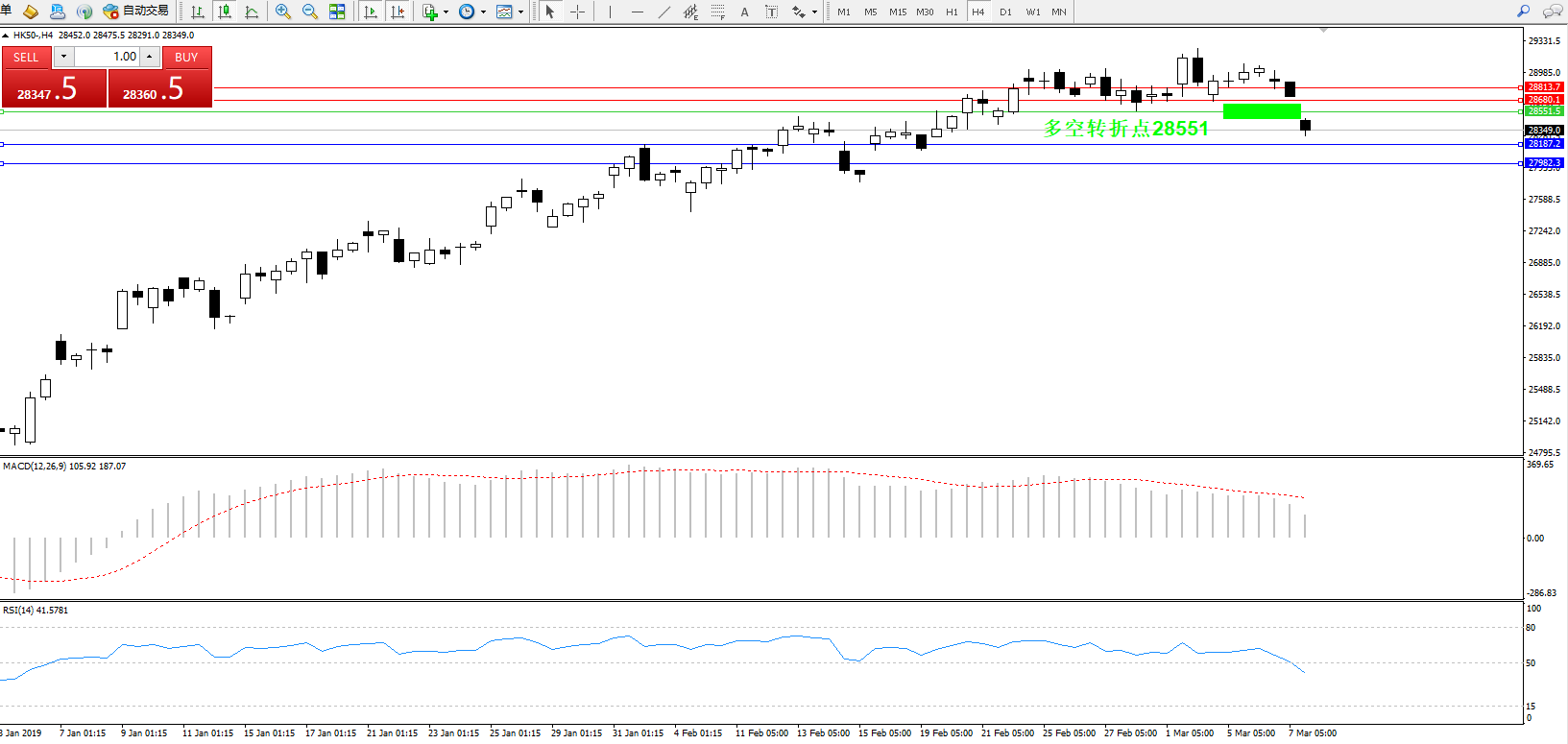 恒指HK50 ——4小时K线图显示: