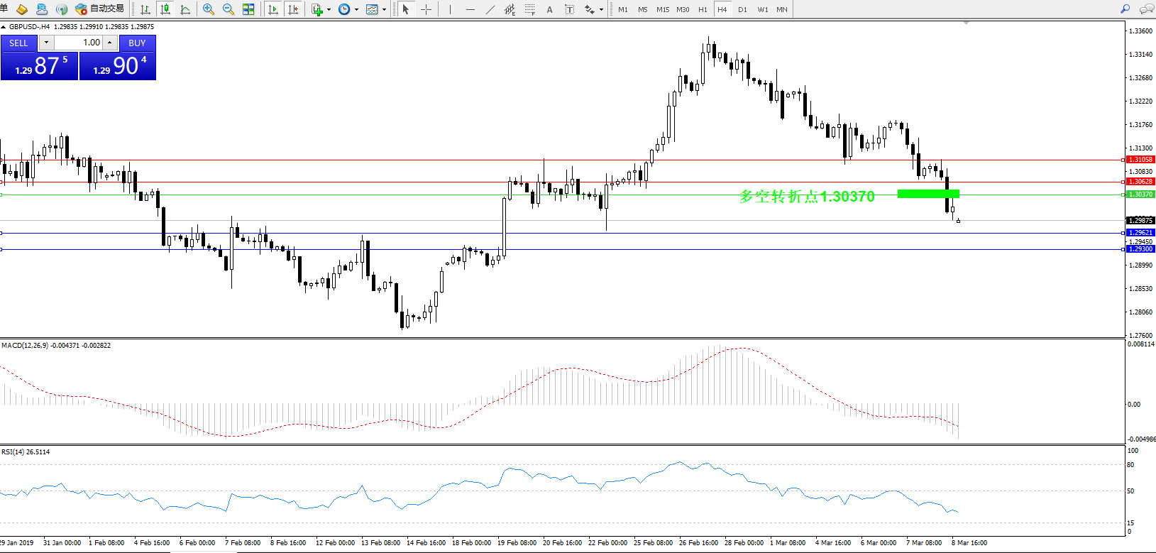 交易策略:1.30370下方看跌,目标1.29621、1.29300