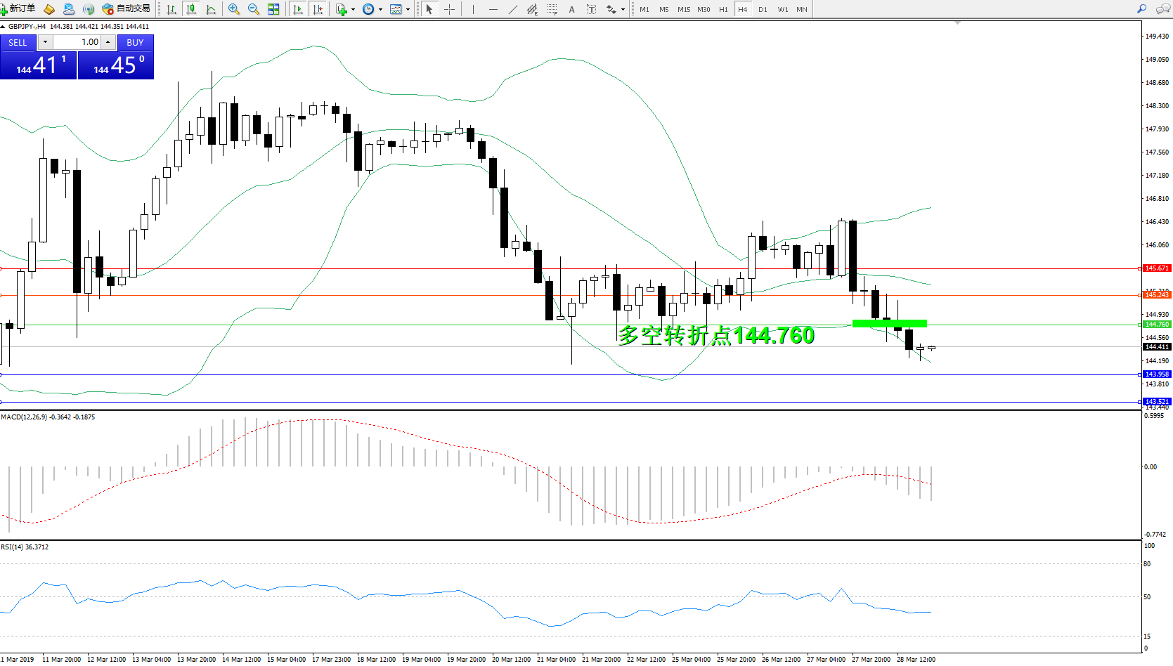 交易策略:144.760下方看跌,目标143.958143.521