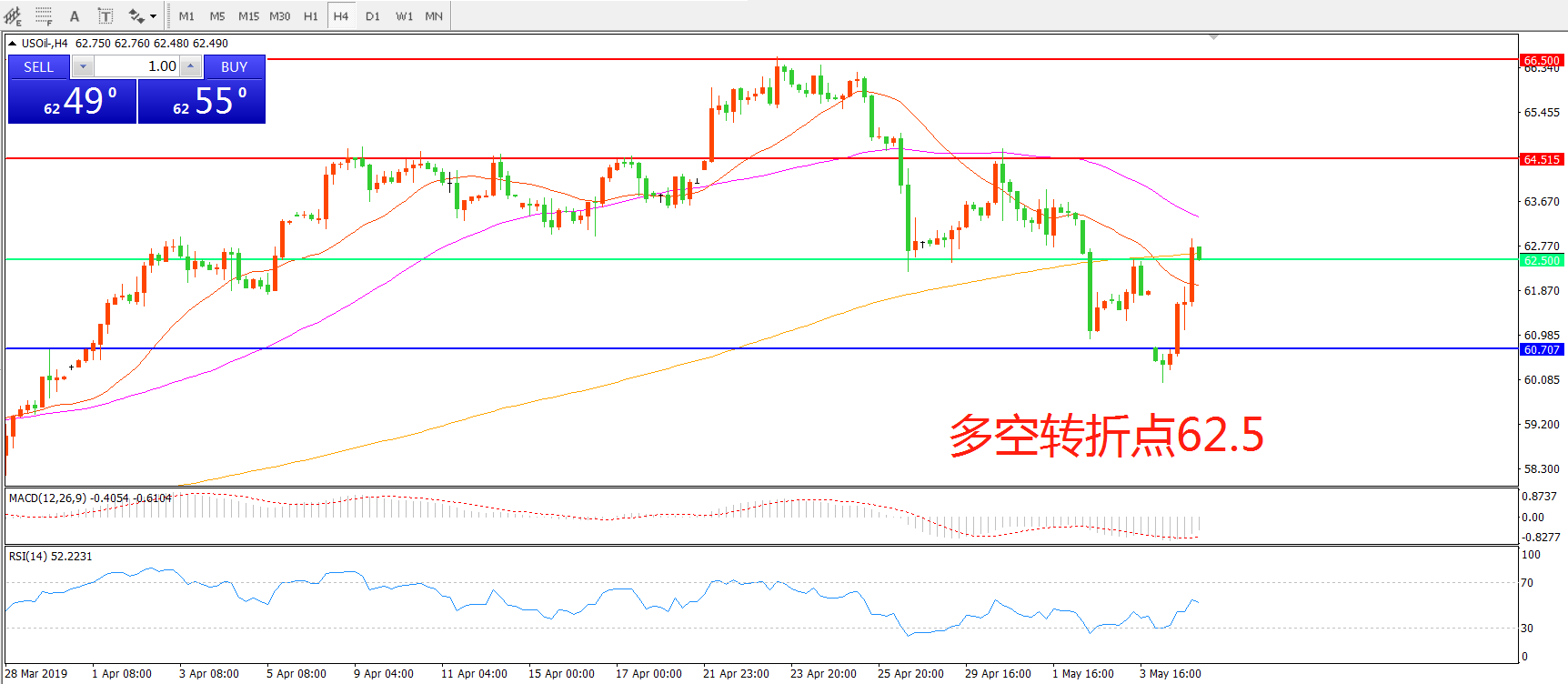 4小时图看,油价跳空低开后于美盘快速收复失地,并重新站上62.5一线,整体走势有所企稳,MACD绿柱减少, RSI指标向下,重点关注62.5一线能否企稳。