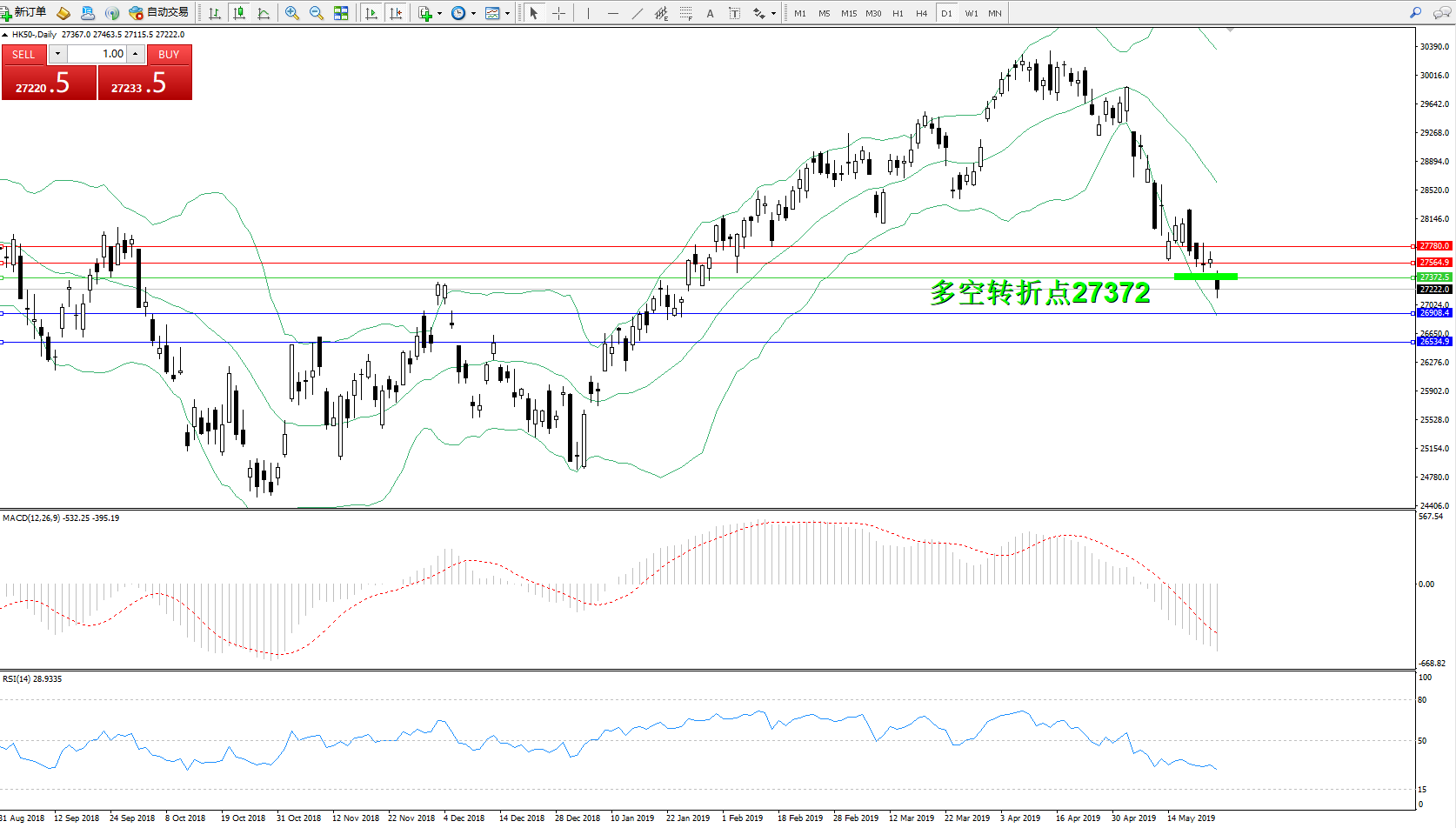 香港恒生指数大幅低开后缓慢走低,截至收盘跌1.65%,报27250.07点。隔夜道琼斯工业平均指数收跌286.14点,报25490.47点,市场担心美中贸易战不断升级将阻碍全球经济增长。美国股市在5月遭遇抛售压力,需求前景黯淡影响,短期内解决贸易战的可能性越来越小,市场显然被吓到了。