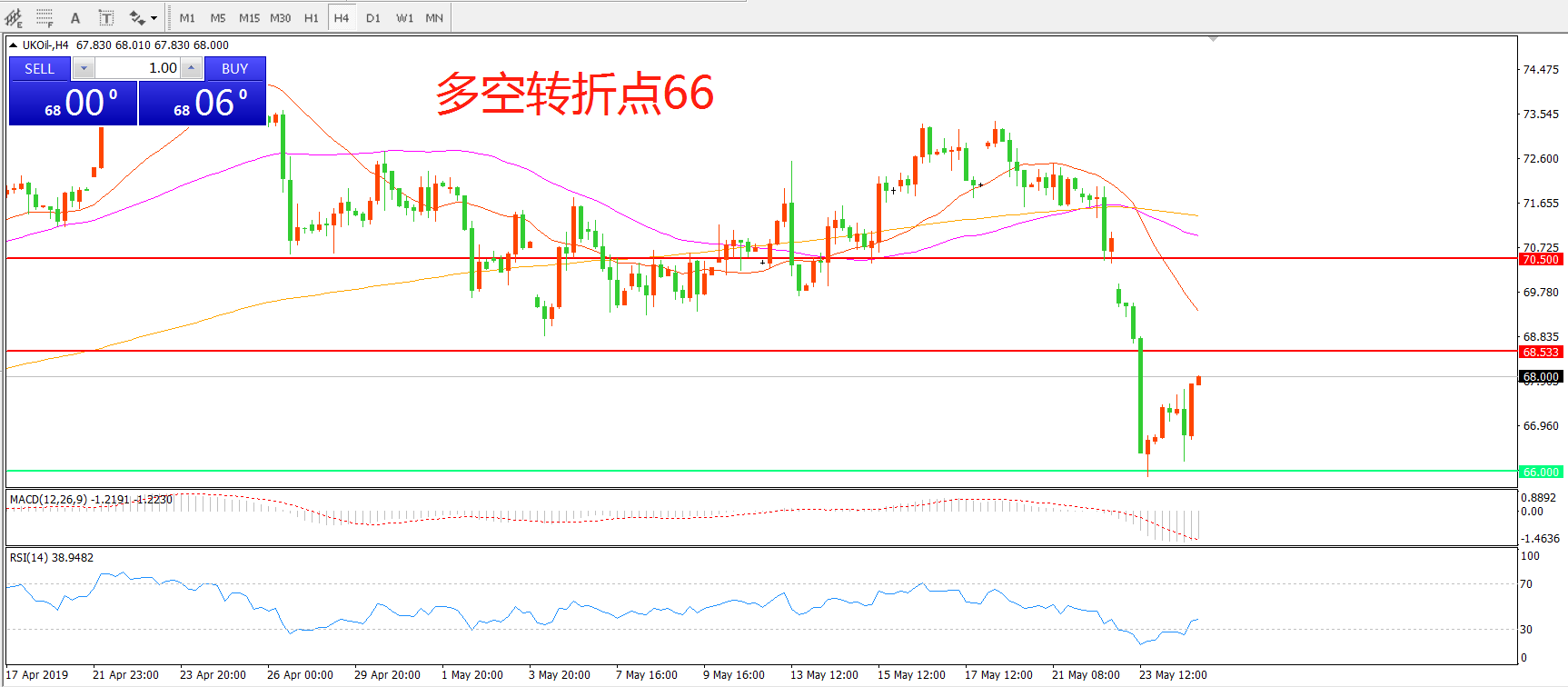 周五(5月24日),市场避险情绪有所降温,油价跌势放缓。布油呈现反弹回升走势,收报68.00美元/桶,在周四油价大幅下跌之后,上周油价跌幅超过7%,欧美经济数据普遍低迷,全球贸易担忧情绪,美国原油库存意外增加重挫油价。但贝克休斯石油活跃钻井减少5座, 连降三周,利多油价。