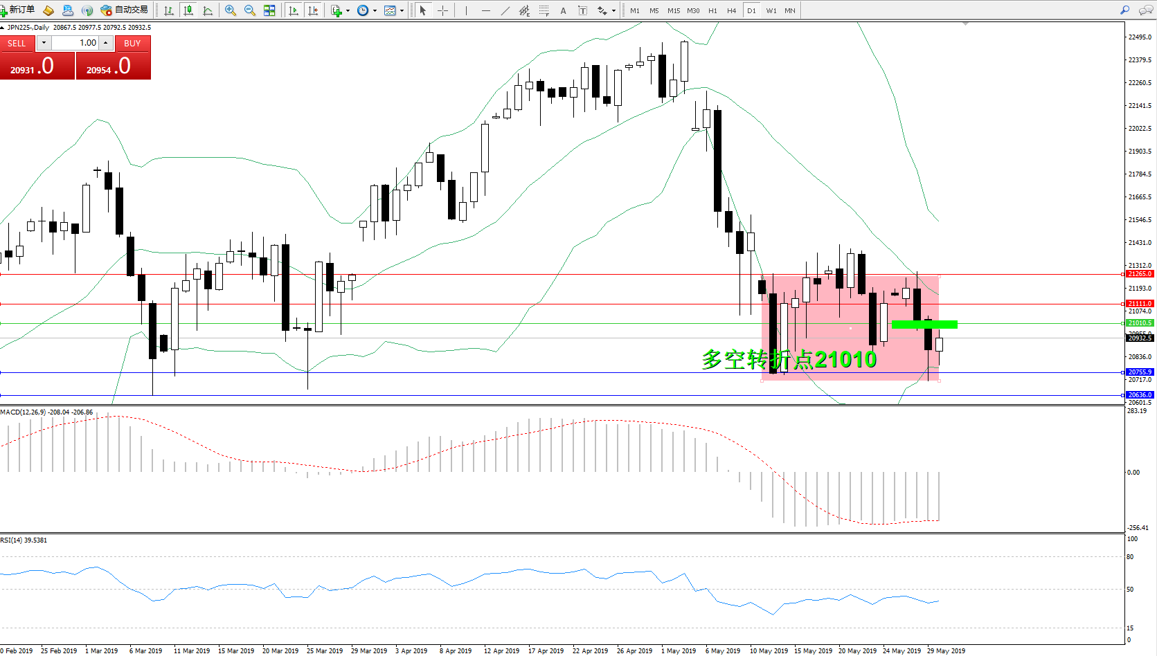日经指数周四收跌至三个半月低点,市场愈发担忧中美贸易战迟迟不能解决将打击经济。日经指数N225收跌0.29%20,942点,为2月中旬以来最低收位。盘中稍早,日经指数一度下跌0.92%20,809点,接近514日的日内低点20,751点。如果在这个水平附近反弹,可能形成双重底部,或许支撑市场,如果跌破那个水准,将推动日经指数跌至2月中旬以来最低位,料进一步冲击已然疲弱的市场人气。