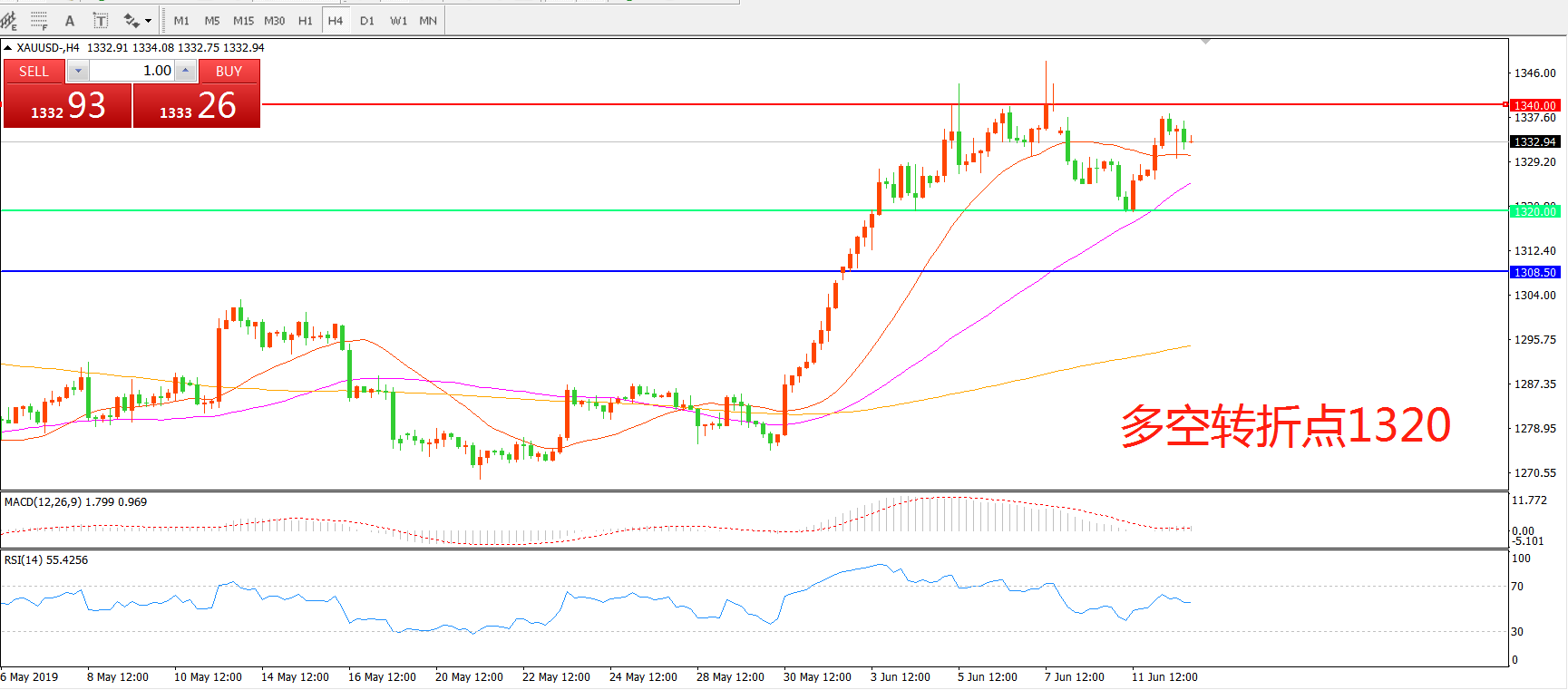 周三(6月12日),美国最新公布的CPI数据逊于预期,显示通胀压力低迷,现货日内刷新1338.26美元/盎司后,最终收报1332.75美元/盎司。现在距离6月18-19日议息会议越来越近,美联储按照惯例进入缄默期,面对复杂的经济形势,FOMC票委在货币政策问题上面临艰难抉择。因贸易争端风险恶化市场预期美联储可能采取更多行动以便为降息铺平道路。眼下市场目光转向定于本周稍晚公布的美国零售销售数据。