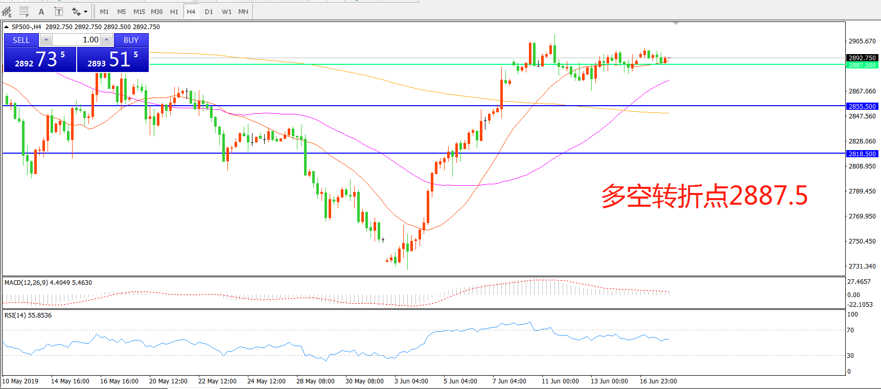 因全球贸易争端有所缓和,更多央行的宽松预期升温令全球股市集体走高,标普500微涨收盘,收报2893.50点。其中,房地产板块和通信服务板块领涨,材料板块和金融板块领跌,近期整个市场都弥漫着浓厚的不确定性。北京时间6月20日(周四)凌晨2点,美联储将公布6月FOMC利率决议。根据CME“美联储观察”数据显示,市场对于美联储在6月会议中降息的概率预期仅19.2%,大部分认为美联储将维持利率不变。假如本周美联储因某些原因上演“鹰派惊奇”,那么市场将变得极其混乱。