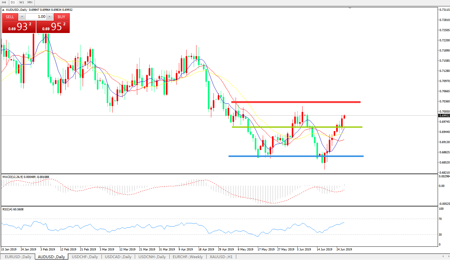 澳元兑美元在周三延续过去一周以来的上行走势,汇价最高触及0.6995,但仍缺少一举突破0.70关口的动力。G20峰会在即,全球市场情绪倾向乐观的状况推动了风险货币走强,但是涨势却遭到同样继续走强的美元指数的打压;日内新西兰联储一如预期按兵不动,没有采取“背靠背”降息政策,此举令投资者都澳洲联储下周降息的预期也有所回落,澳元因此走强。在隔夜美联储主席鲍威尔讲话暗示降息并非理所当然之后,此前席卷全球的宽松预期浪潮已略有降温,市场将观望各国领导人在此后G20会议上的表态,来判断阅读下一步的全球经济和货币政策走向。