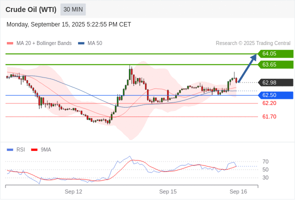 在 62.50 之上,看涨,目标价位为 63.65 ,然后为 64.05 。