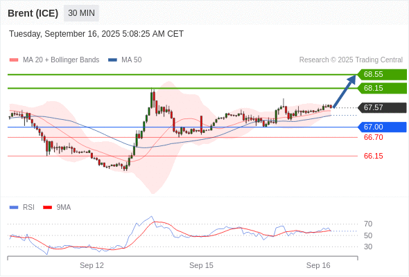 布伦特原油 (ICE) (X5) 当日内: 在67.00之上,看涨。