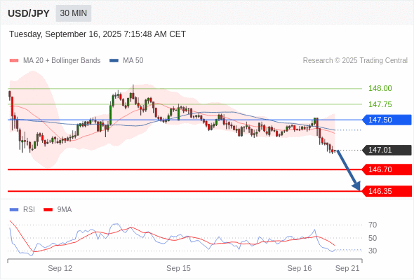 在 147.50 之下,看跌,目标价位为 146.70 ,然后为 146.35 。