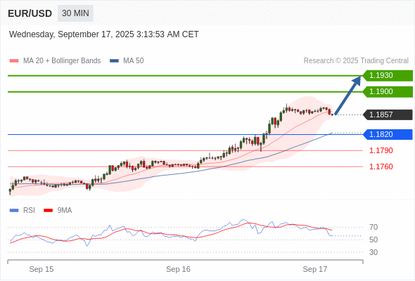 在 1.1820 之上,看涨,目标价位为 1.1900 ,然后为 1.1930 。