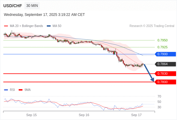 在 0.7900 之下,看跌,目标价位为 0.7830 ,然后为 0.7800 。