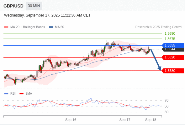 在 1.3655 之下,看跌,目标价位为 1.3620 ,然后为 1.3580 。