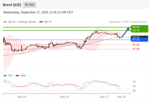 在 67.85 之上,看涨,目标价位为 68.60 ,然后为 69.00 。