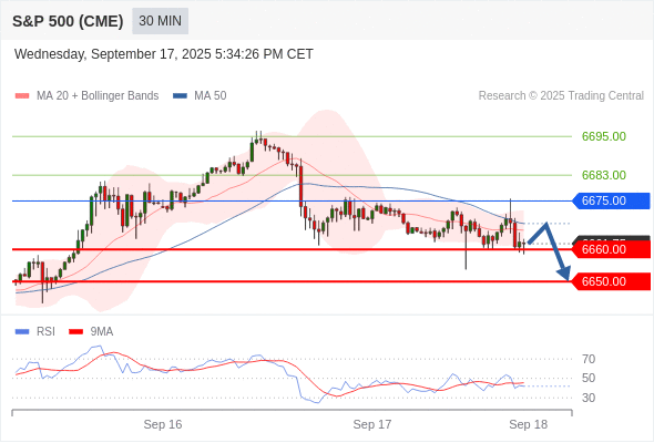 在 6675.00 之下,看跌,目标价位为 6660.00 ,然后为 6650.00 。
