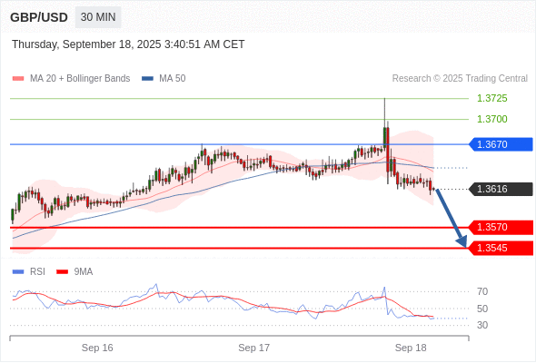 在 1.3670 之下,看跌,目标价位为 1.3570 ,然后为 1.3545 。