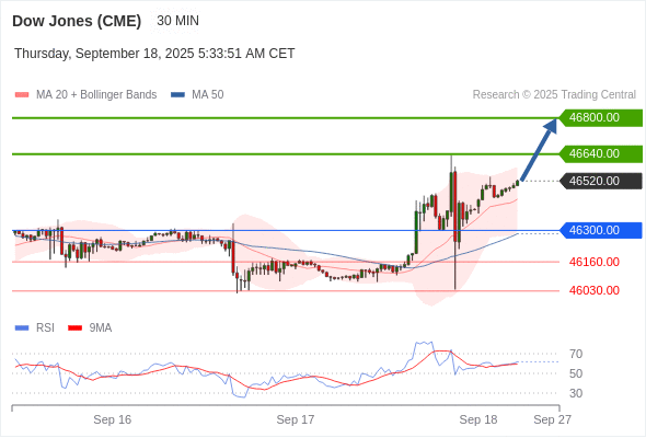美国道琼斯指数期货 (Z5) 当日内: 目标位为46800.00。