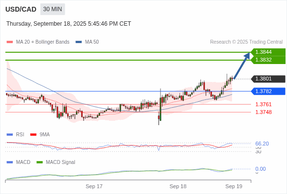 美元/加元 当日内 : 看涨,当 1.3782 为支撑位。