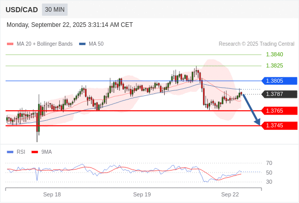 美元/加元 当日内: 短期关键阻力位在1.3805。