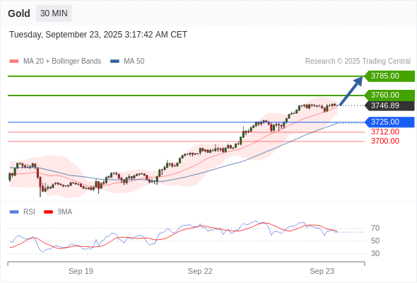 在 3725.00 之上,看涨,目标价位为 3760.00 ,然后为 3785.00 。