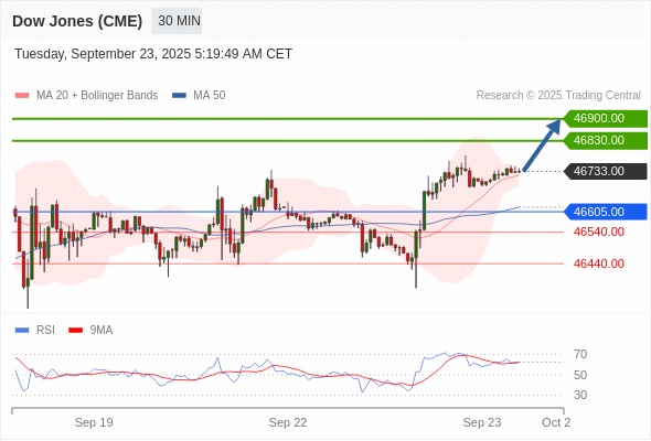 美国道琼斯指数期货 (Z5) 当日内: 在46605.00之上,看涨。