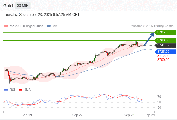 在 3725.00 之上,看涨,目标价位为 3760.00 ,然后为 3785.00 。