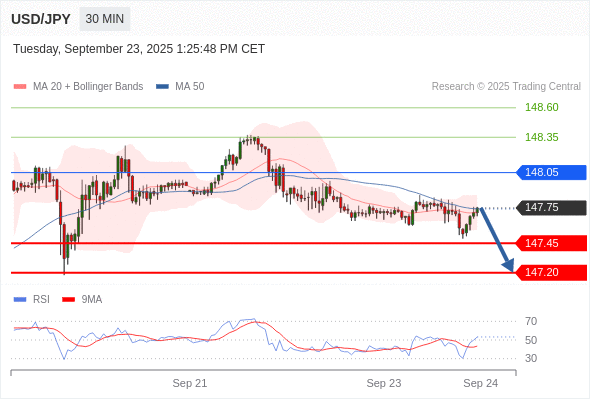 在 148.05 之下,看跌,目标价位为 147.45 ,然后为 147.20 。