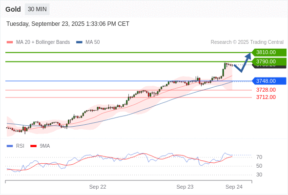 在 3748.00 之上,看涨,目标价位为 3790.00 ,然后为 3810.00 。