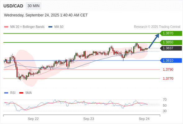 在 1.3810 之上,看涨,目标价位为 1.3850 ,然后为 1.3870 。
