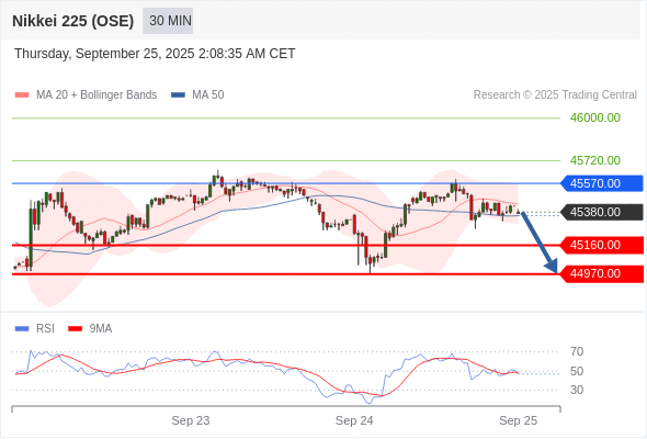 在 45570.00 之下,看跌,目标价位为 45160.00 ,然后为 44970.00 。