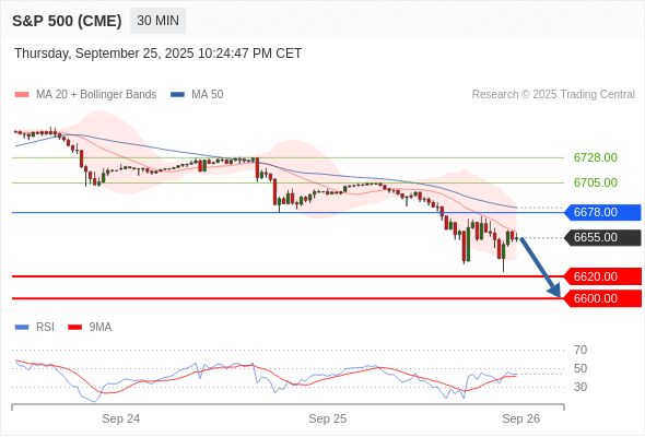 美国标普500指数期货 (Z5) 当日内: 短期关键阻力位在6678.00。