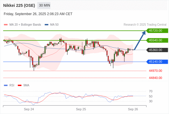 日经225股指期货 (OSE) 当日内: 在45140.00之上,看涨。