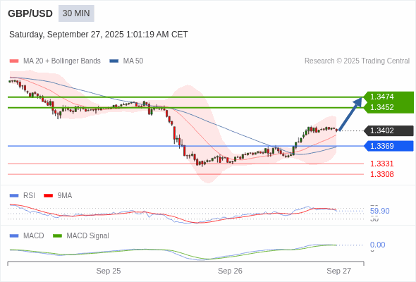 交易策略: 看涨,当 1.3369 为支撑位,目标定在1.3474。