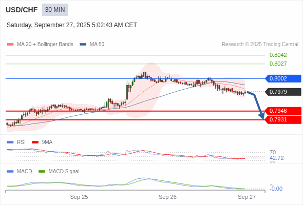美元/瑞郎 当日内 : 看跌,在 0.8002 之下。