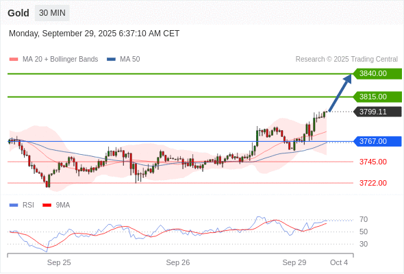 在 3767.00 之上,看涨,目标价位为 3815.00 ,然后为 3840.00 。