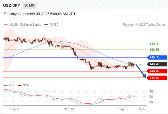 交易策略: 在 149.00 之下,看跌,目标价位为 148.40 ,然后为 148.10 。