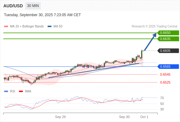 在 0.6565 之上,看涨,目标价位为 0.6635 ,然后为 0.6650 。