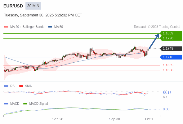 欧元/美元 当日内 : 看涨,当 1.1716 为支撑位,目标定在1.1809。