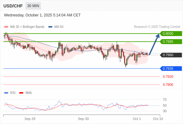 美元/瑞郎 当日内: 在0.7935之上,看涨。