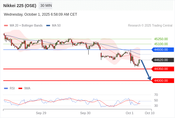 在 44930.00 之下,看跌,目标价位为 44350.00 ,然后为 44000.00 。