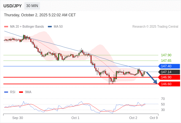 交易策略: 在 147.40 之下,看跌,目标价位为 146.90 ,然后为 146.60 。