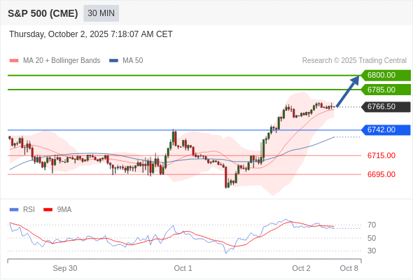 在 6742.00 之上,看涨,目标价位为 6785.00 ,然后为 6800.00 。