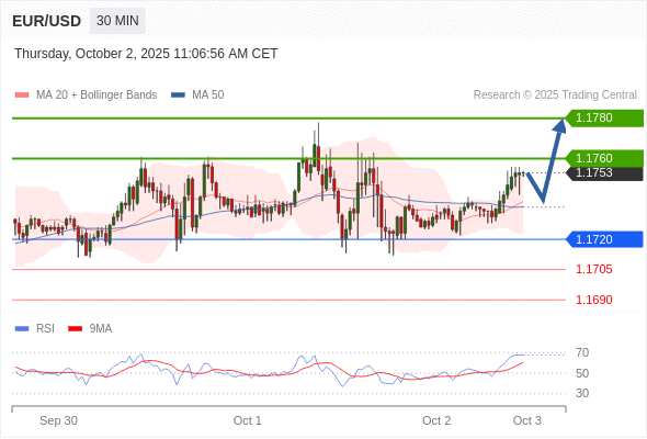 在 1.1720 之上,看涨,目标价位为 1.1760 ,然后为 1.1780 。