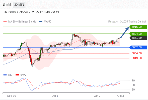 在 3852.00 之上,看涨,目标价位为 3894.00 ,然后为 3915.00 。