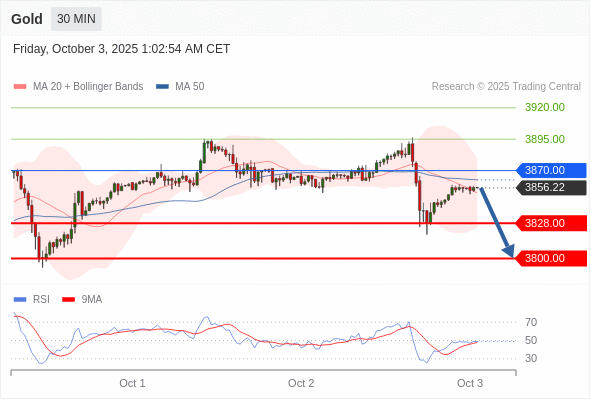 交易策略: 在 3870.00 之下,看跌,目标价位为 3828.00 ,然后为 3800.00 。