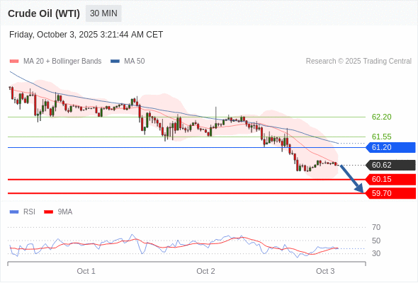 在 61.20 之下,看跌,目标价位为 60.15 ,然后为 59.70 。