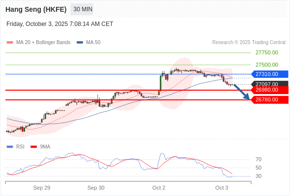 在 27310.00 之下,看跌,目标价位为 26980.00 ,然后为 26780.00 。