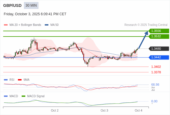 英镑/美元 当日内 : 看涨,当 1.3442 为支撑位。
