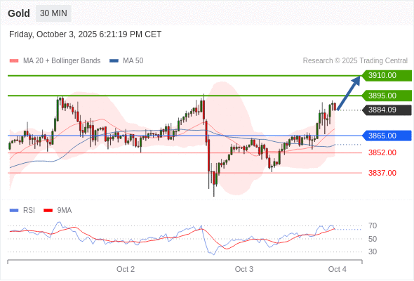 在 3865.00 之上,看涨,目标价位为 3895.00 ,然后为 3910.00 。